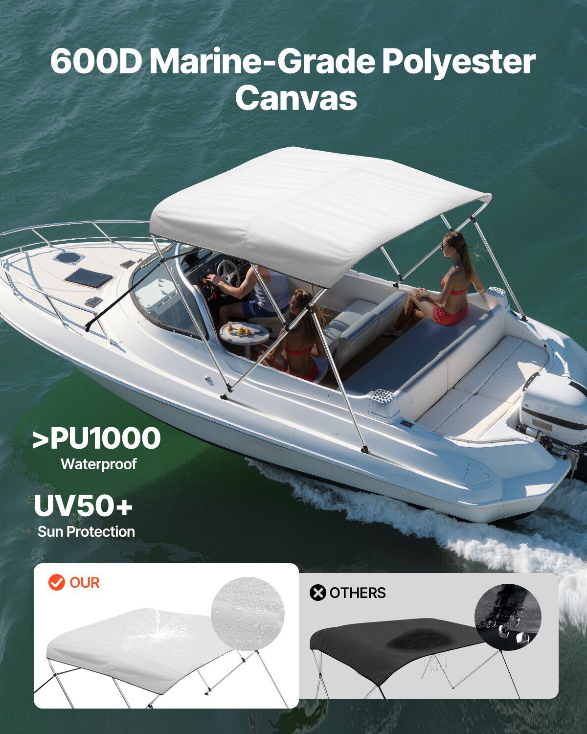 1.Durable 600D Sunshade Fabric: This boat awning is made from heavy-duty 600D marine-grade polyester fabric, offering excellent UV protection (Sun Shade) and water resistance (>PU1000). The fabric is designed to last longer without fading or cracking, thanks to its high-density weave and double-stitched seams. Ideal for keeping you cool and dry on the water!